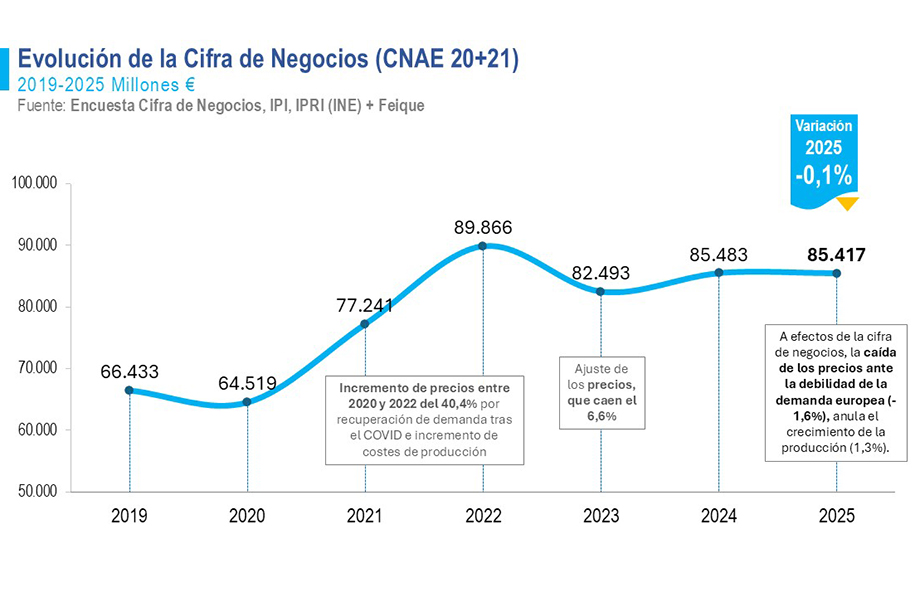 El sector químico español cerró 2025 sin crecimiento, con una cifra de negocio de 85.417 millones de euros, el -0,1% que en 2024.