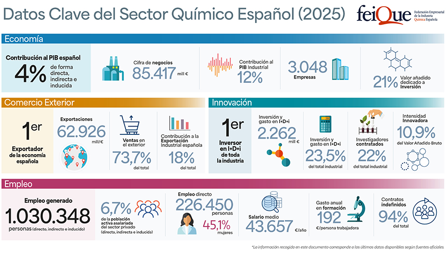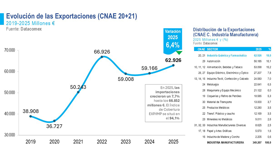 Igualmente, en 2025, las exportaciones del sector químico español crecieron un 6,4% hasta los 62.926 millones de euros. Precisamente, 73,7% del negocio del sectgor químico español procede de los mercados exteriores. Por zonas geográficas, el 56% de las exportaciones tuvo como destino países de la Unión Europea, siendo Francia (9,6%), Alemania (8,9%) y Países Bajos (7,1%) los principales mercados de destino. Por su parte, las exportaciones extracomunitarias se dirigieron principalmente a EE.UU. (4,9%), Suiza (3,6%) y China (3,3%).